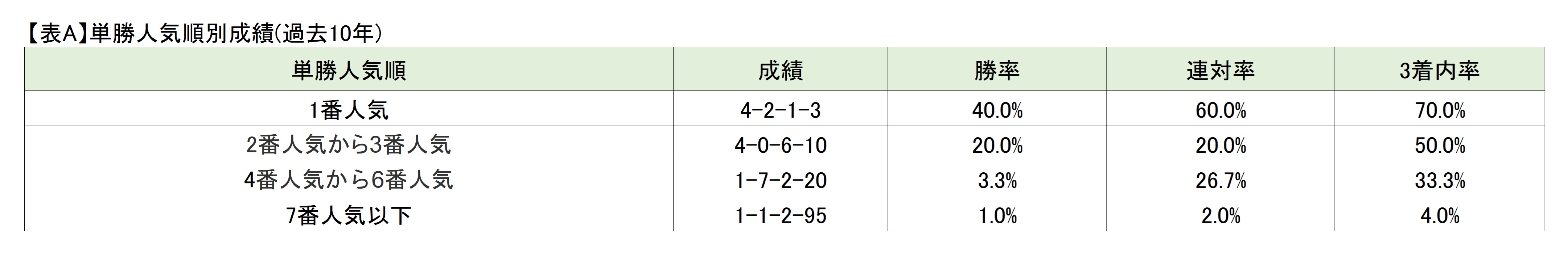 M 過去10年の単勝人気順別成績を見ると、3着以内馬延べ31頭のうち27頭が6番人気以内。人気薄の馬はあまり上位に食い込めていません。