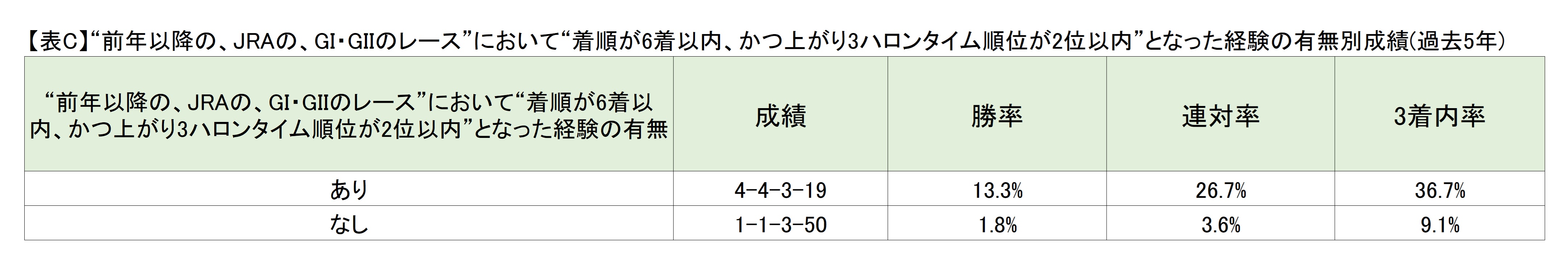 伊吹 一方、“前年以降の、JRAの、GI・GIIのレース”において“着順が6着以内、かつ上がり3ハロンタイム順位が2位以内”となった経験を持たない、かつ前走の着順が2着以下だった馬は2020年以降[0-0-1-43](3着内率2.3%)。これらの条件に引っ掛かっている馬は、評価を下げるべきでしょう。