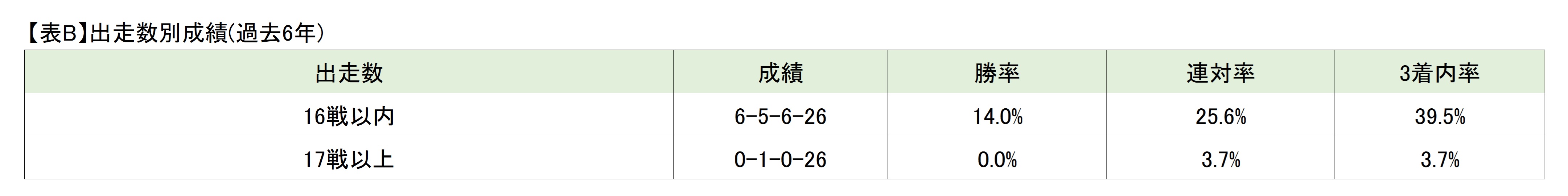 伊吹 まずは出走数をチェックしておきたいところ。2019年以降の3着以内馬18頭中17頭は、キャリア16戦以内でした。