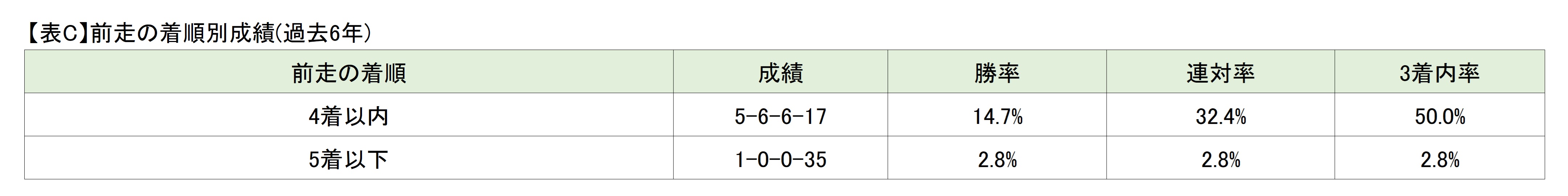 伊吹 あとは直近のパフォーマンスも素直に評価した方が良さそう。同じく2019年以降の3着以内馬18頭中17頭は、前走の着順が4着以内でした。